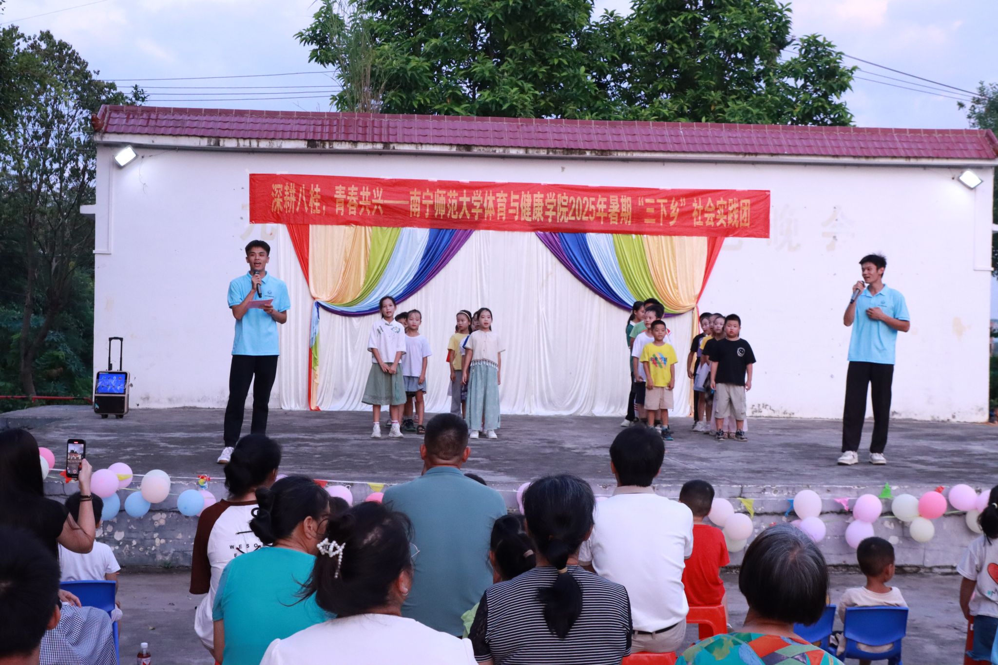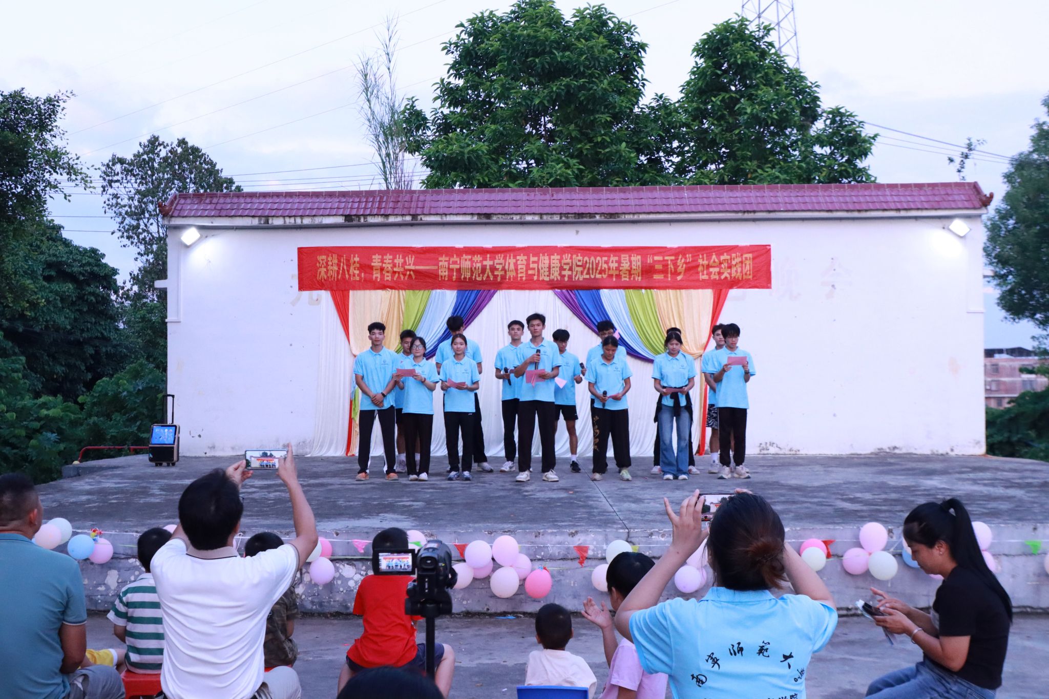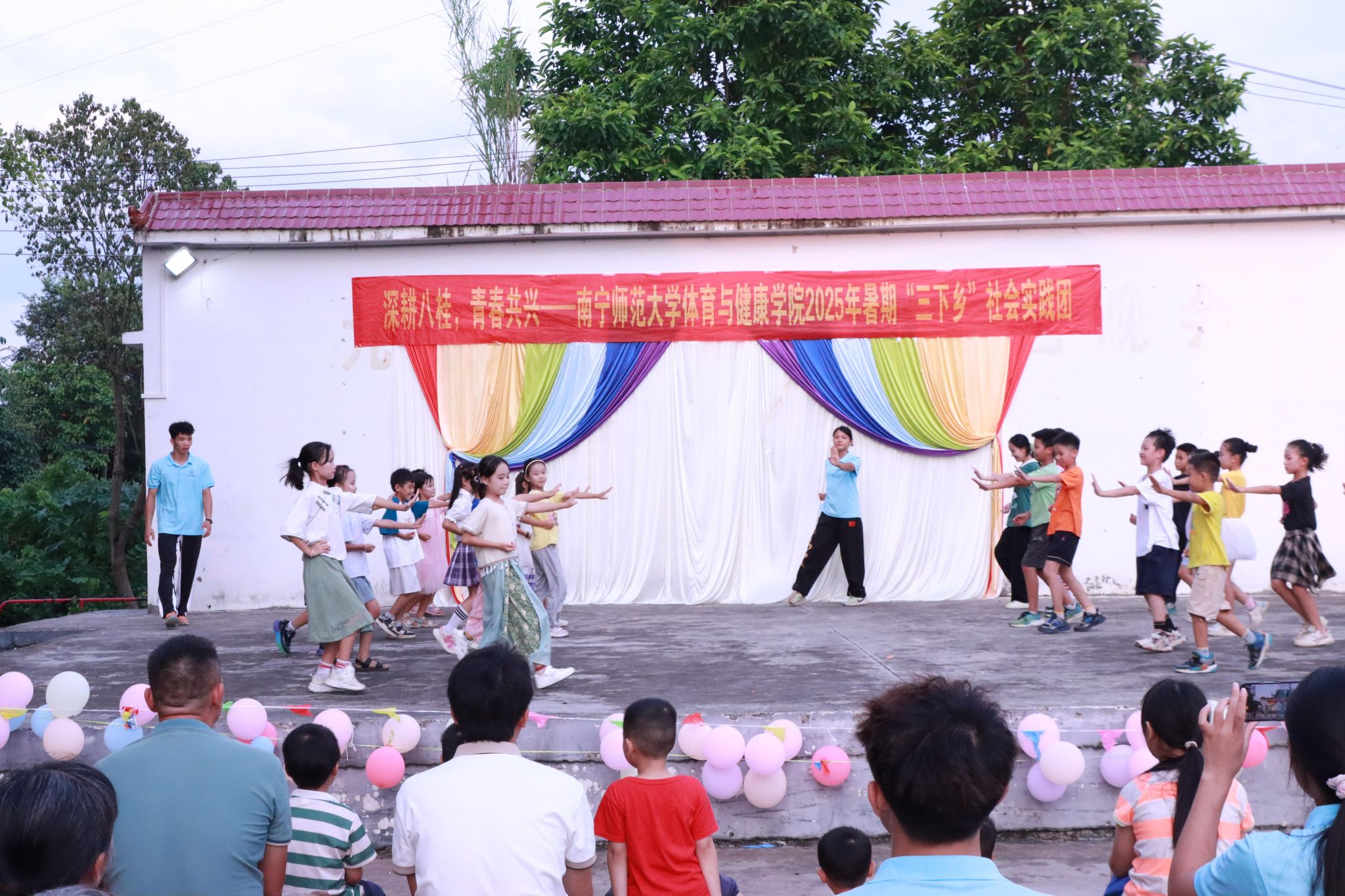 为助力乡村振兴,丰富乡村精神文化生活,7月20日,william威廉英国官网“体健赋能·壮韵九联”实践团在南宁市武鸣区九联村村委会广场开展暑期“三下乡”社会实践活动汇报演出。公司党委副书记陈军弟,团委书记农梦莲到场,由实践团队员伍南舟、马林主持,实践团全体队员和九联村小员工参加。