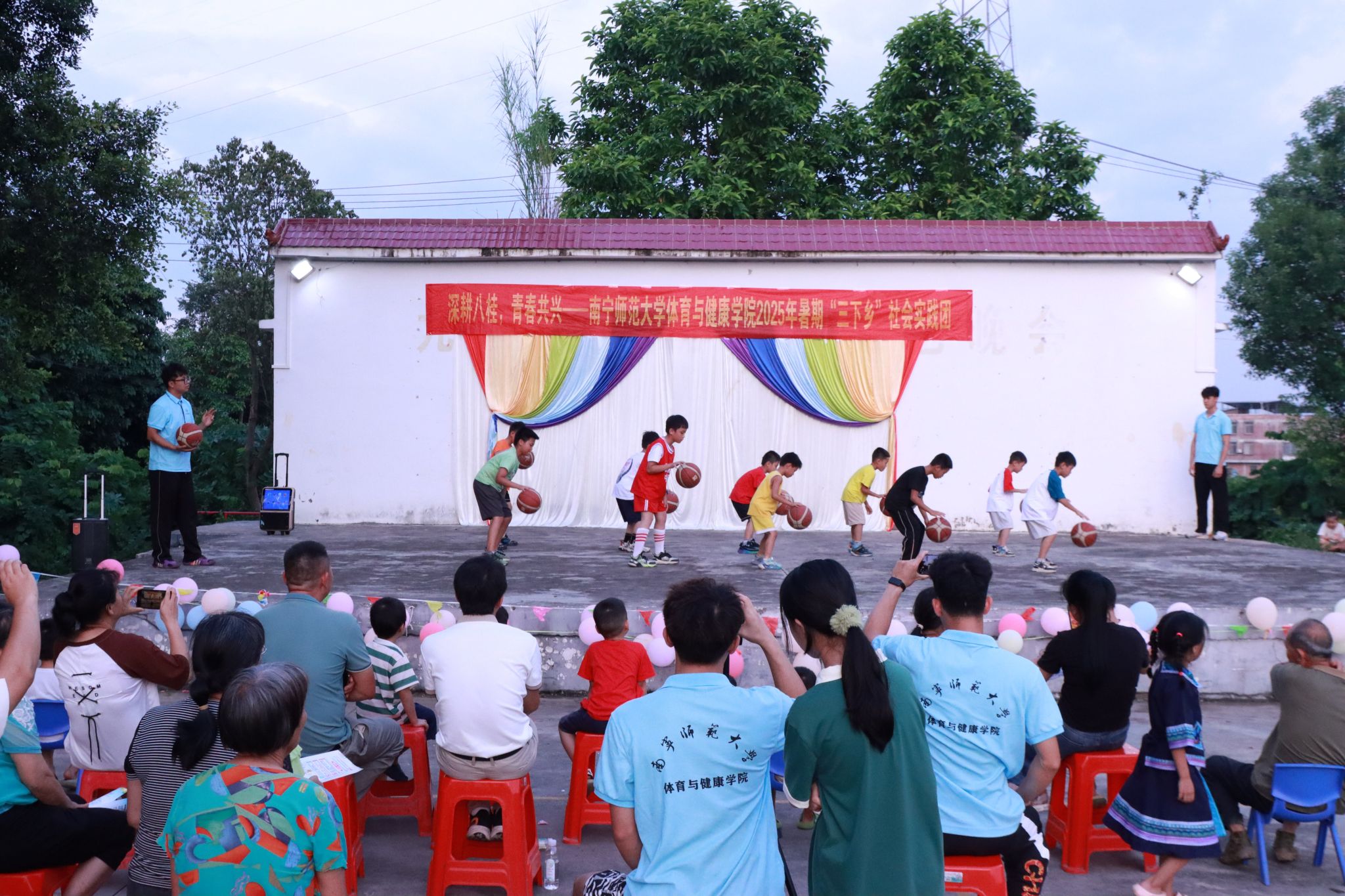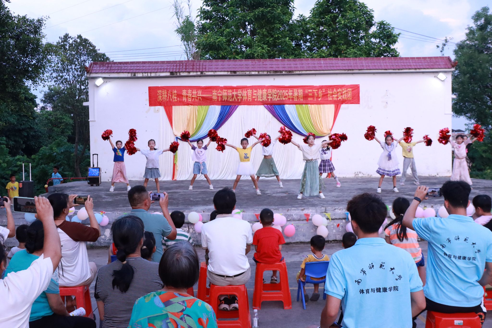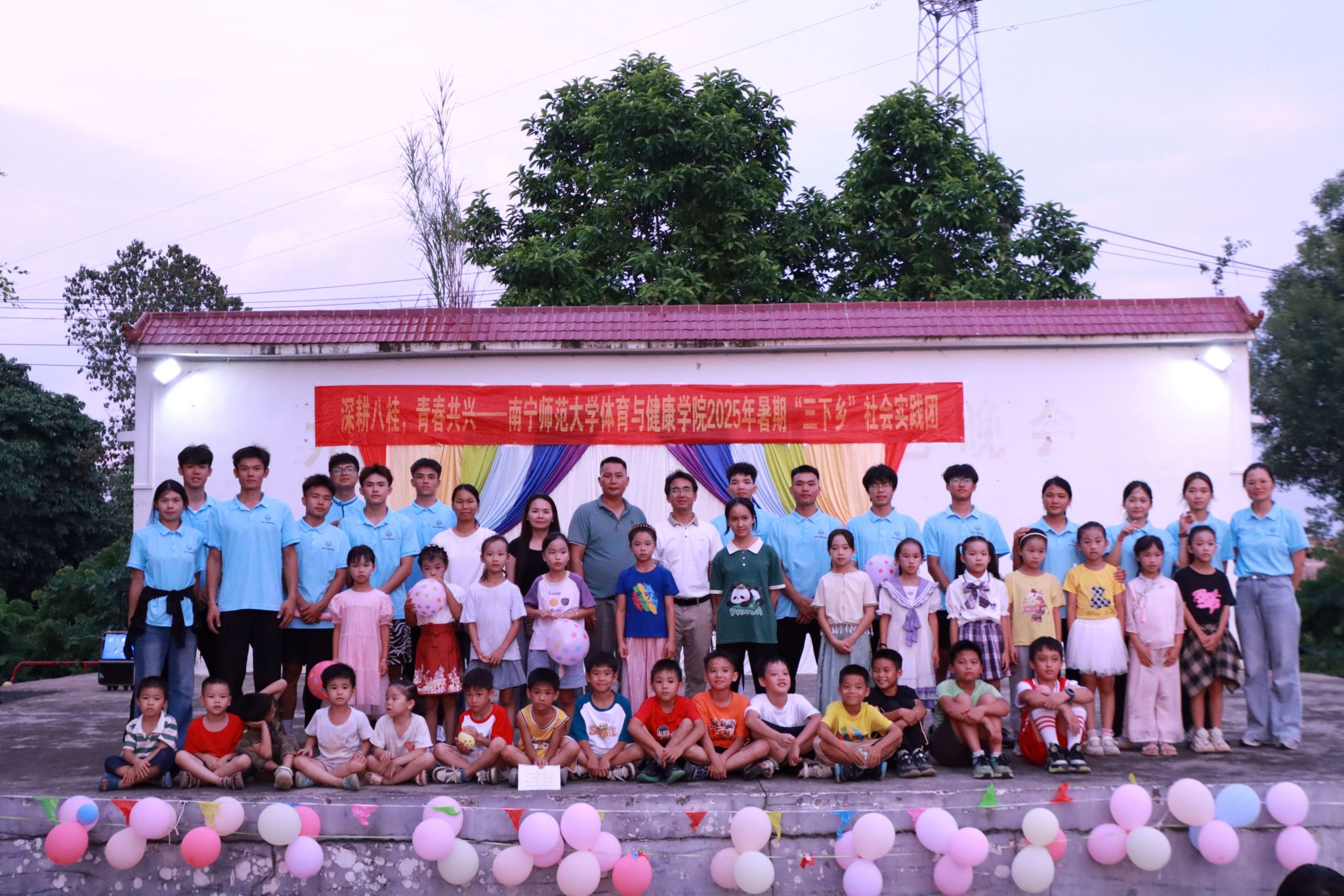 为助力乡村振兴,丰富乡村精神文化生活,7月20日,william威廉英国官网“体健赋能·壮韵九联”实践团在南宁市武鸣区九联村村委会广场开展暑期“三下乡”社会实践活动汇报演出。公司党委副书记陈军弟,团委书记农梦莲到场,由实践团队员伍南舟、马林主持,实践团全体队员和九联村小员工参加。
