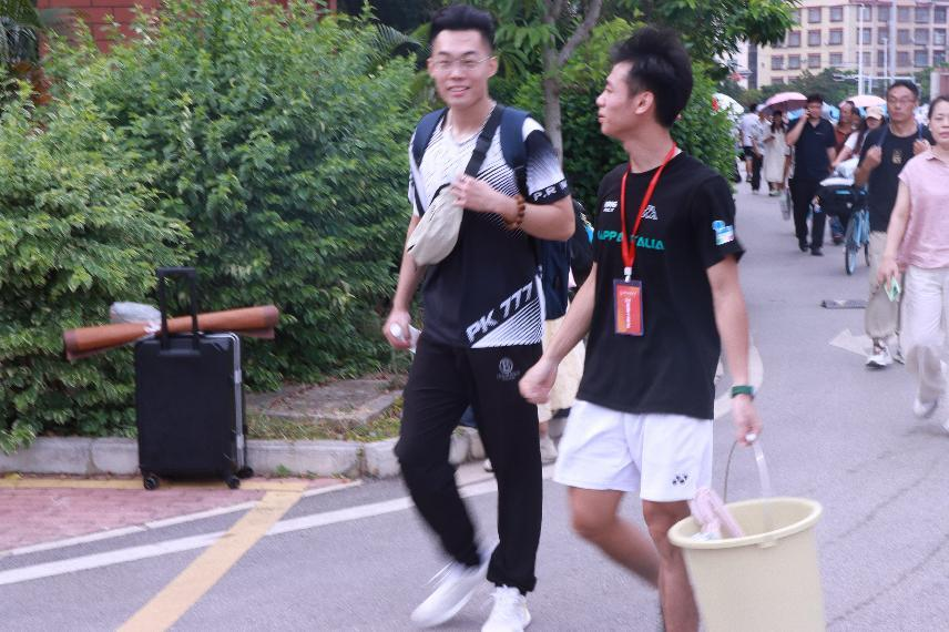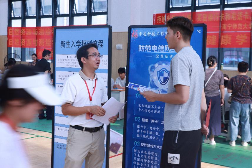 迎新当天,志愿者们统一佩戴鲜红工作证,活跃在车站出口、校门通道、报到注册点等关键位置,成为校园中一道温暖而亮丽的风景。他们热情引导、耐心答疑,协助新生高效完成入学手续。许多志愿者主动帮助搬运行李,一路陪伴至宿舍,并贴心分享校园生活与学习经验,助力新生快速适应大学环境。平安护航辅导员工作室还在现场开展防诈骗宣传,为新生的安全保驾护航。