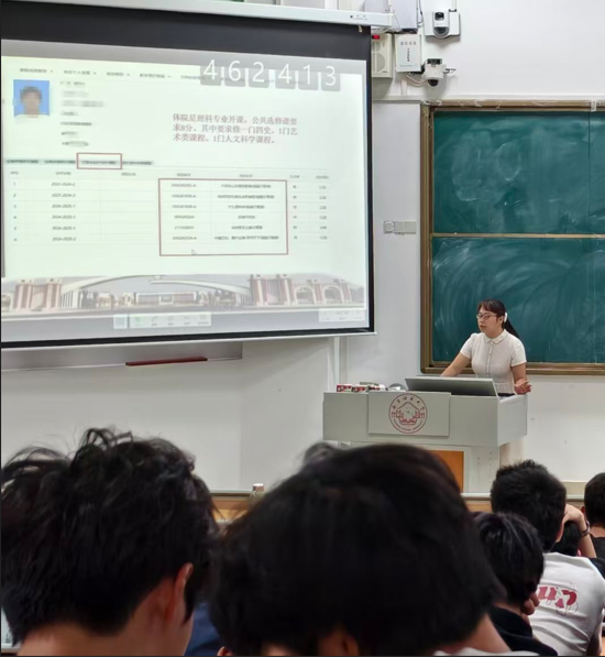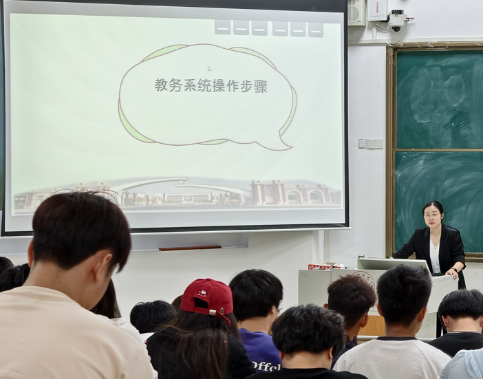 随后,教学秘书曾雪莲老师还专门针对员工教务系统操作进行了细致讲解。从课程选修流程到学分考评标准,她手把手指导新生熟悉系统功能,帮助大家掌握运用教务系统安排学业的技巧,为后续选课、查分、学业规划等环节提供实用指引,让新生对大学学业管理有了更清晰的方向与把控力。