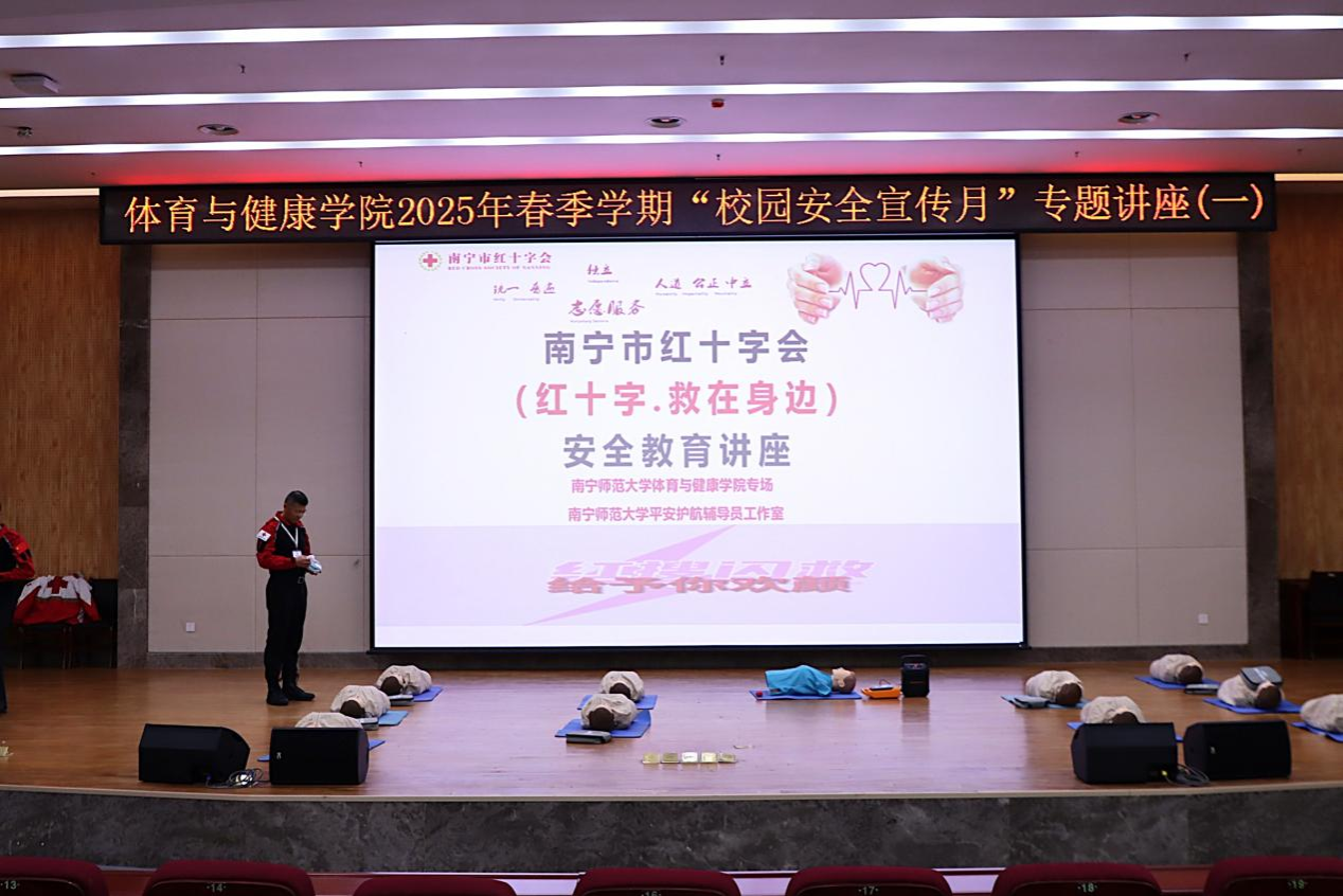 经理助理马泓宇宣布公司“校园安全宣传月”正式启动后,由南宁市红十字会苏耀彬、胡华民两位老师开展“校园安全宣传月”专题讲座,讲座主题为“红十字:救在身边”。