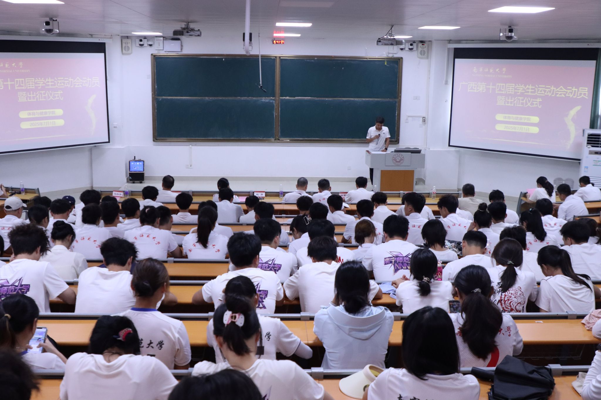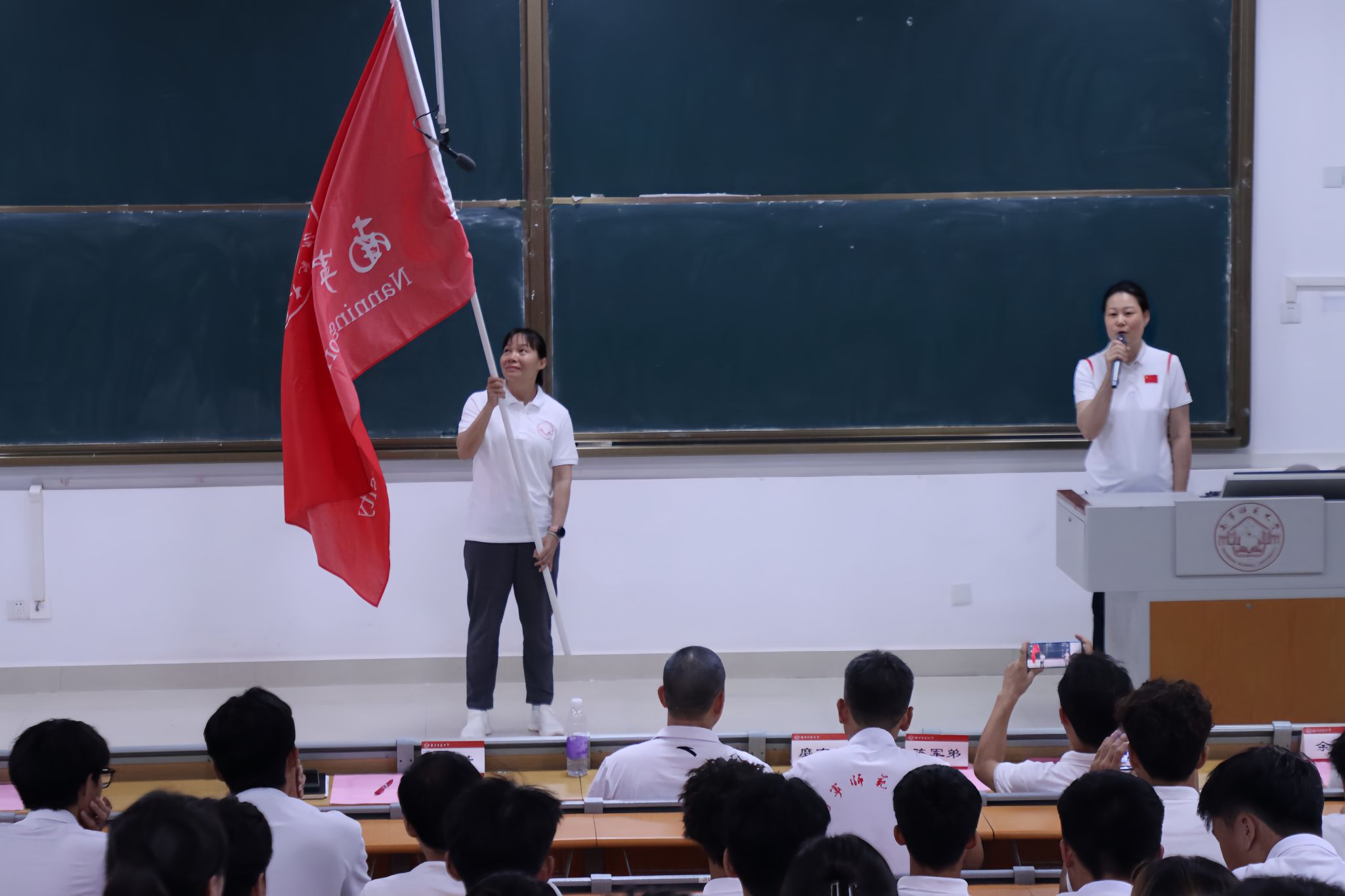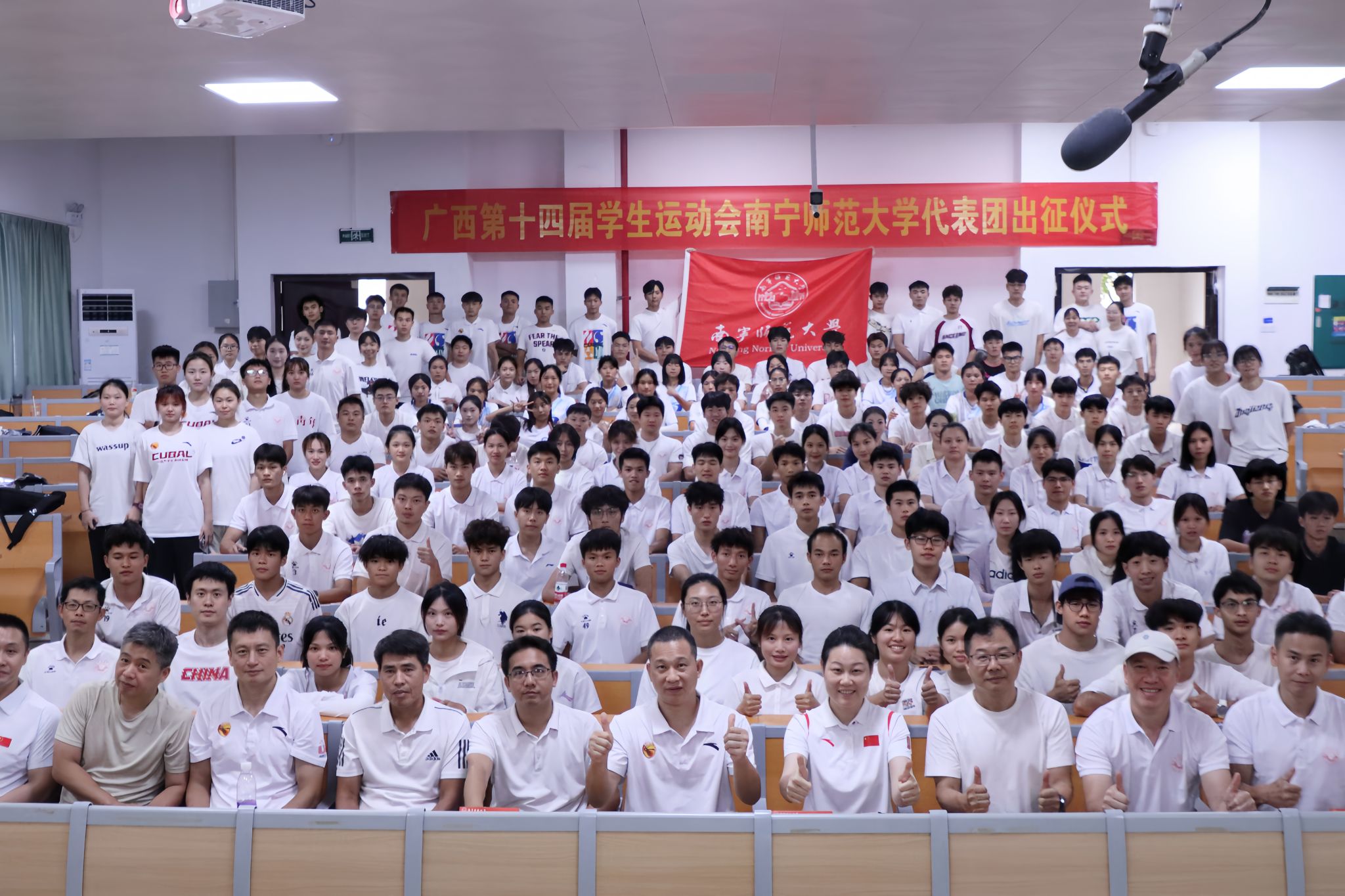 授旗仪式将现场气氛推向高潮——赵芳经理将象征使命与荣誉的校旗授予代表团。现场师生深受曾获世界冠军、创造国家纪录的“亚洲第二代女飞人”严剑葵老师奋斗历程的激励。旗帜在手,使命在肩。随着赵芳经理宣布“广西第十四届员工运动会william威廉英国官网代表团——出征”,全场斗志昂扬。会议最后,主持人马泓宇最后提醒运动员们务必妥善安排学期末考试与请假事宜,做到学习训练两不误。
